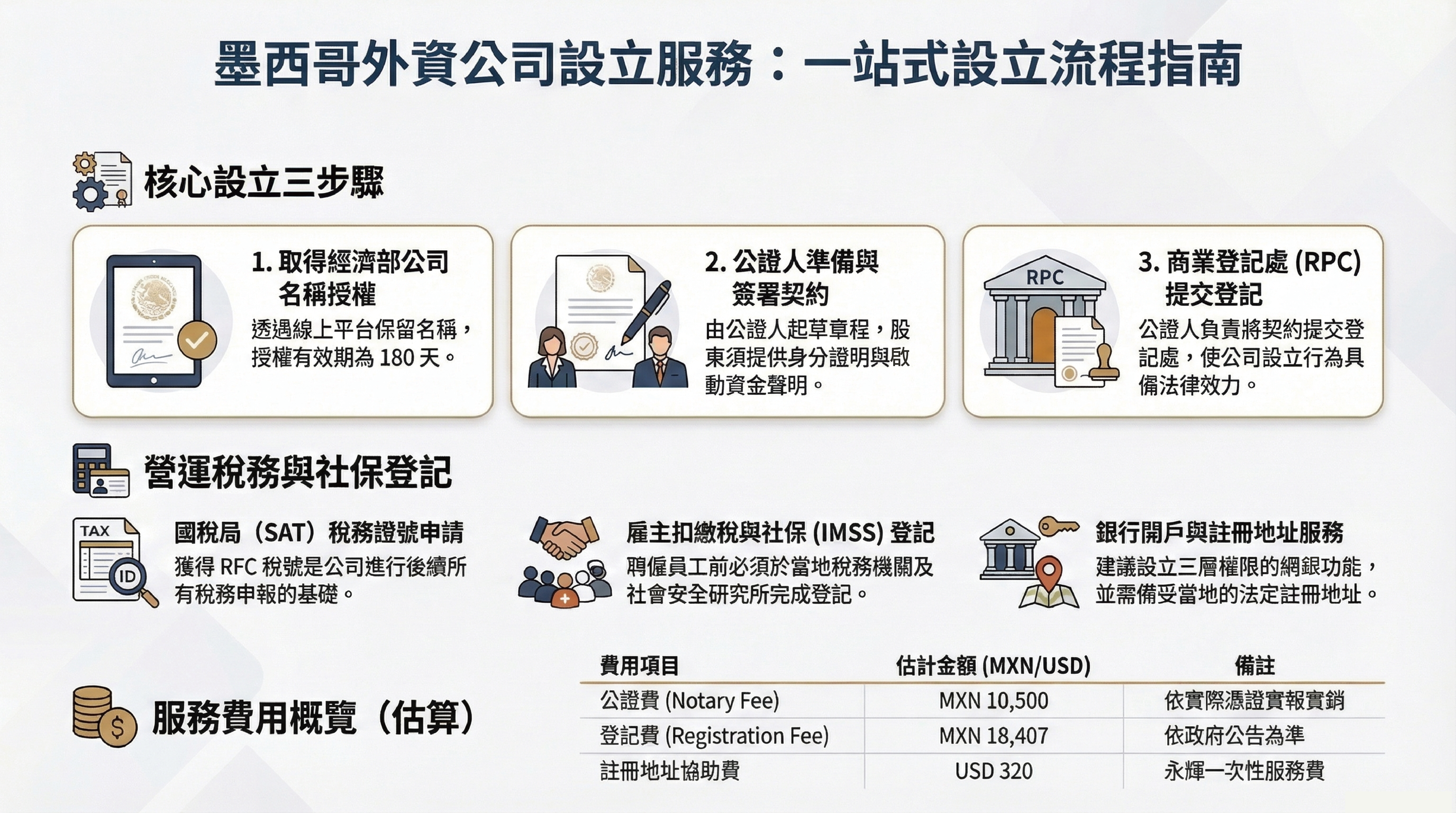 墨西哥主要城市公司設立登記,進出口證,特許行業申請等。公司設立後雲端系統支援的會計薪資服務。 墨西哥與臺灣同事攜手協同爲您服務。為地球暖化盡一份心力,減少空中旅行。