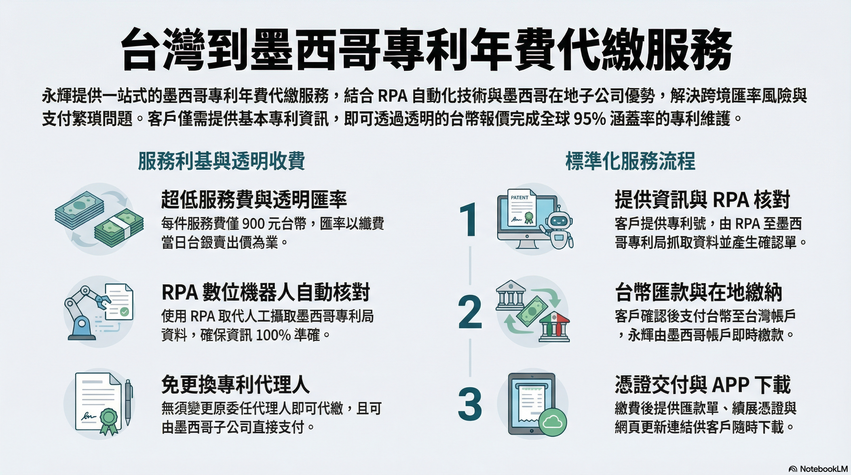永輝團隊會用RPA數位機器人去墨西哥智慧財產局取得專利相關資料,並產生”專利委任確認單”列出墨西哥的官費,加上永輝服務費。